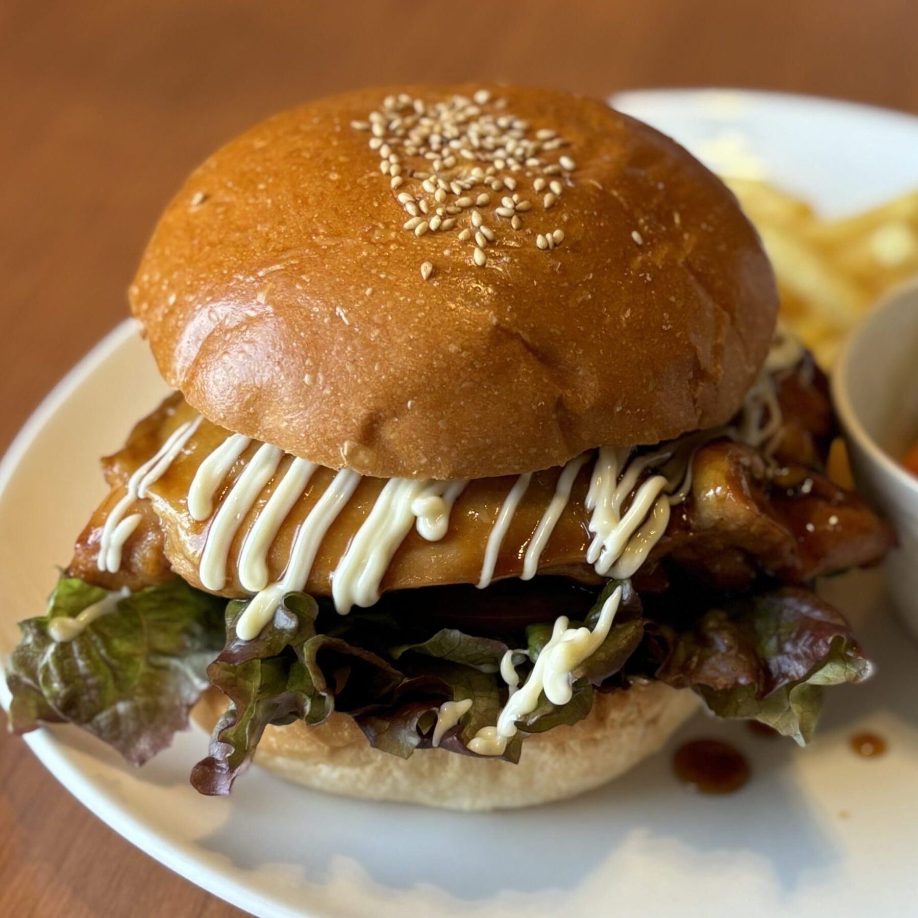 香ばしく焼いた鶏もも肉に、甘辛の自家製照り焼きソースをたっぷり絡め、ふっくらバンズでサンド。